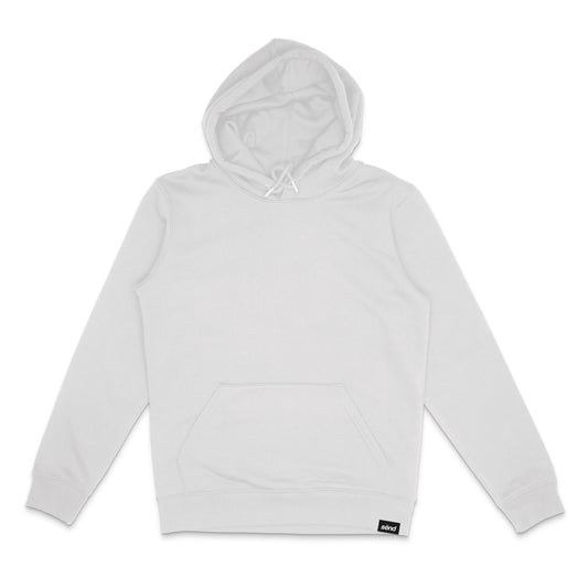 • Backside of a white hoodie for bikers with a bold sënd unltd graphic print