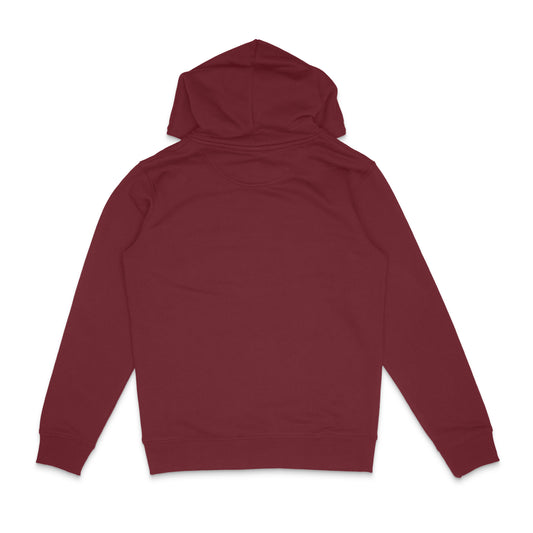 • Backside of a burgundy red zip-hoodie for bikers with a bold sënd unltd logo print