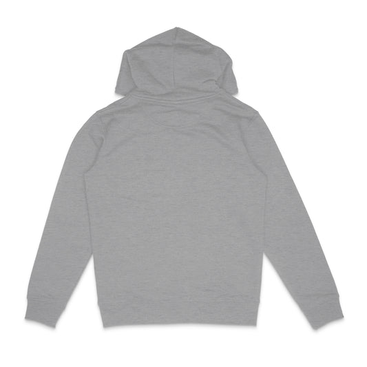 • Frontside of a heather grey hoodie for bikers with a small sënd logo print on the chest