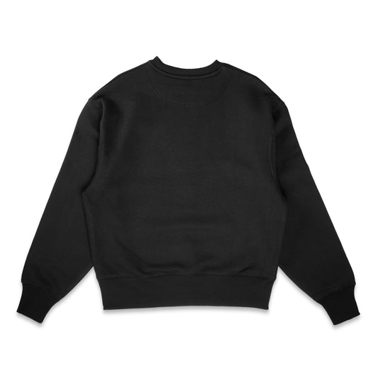 • Frontside of a black crewneck sweater for bikers with a bold sënd wrldwd graffiti tag on the chest